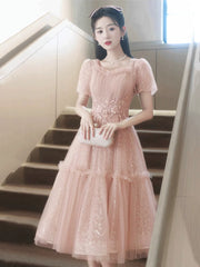 Sweetheart Pink Tulle Sequins With Applique Short Sleeve Prom Dress Party Dress