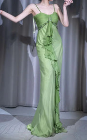 Unique Mermaid Spaghetti Strap Beaded Ruffle Green Satin Chiffon Party Dress