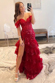 Red Sequin-Embroidery Off-the-Shoulder Tiered Long Prom Dress with Slit