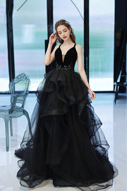 A-Line Deep V Neck Ruffle Tiered Tulle Lace Black Long Prom Dress With Applique blend of drama, elegance, and modern allure for your most unforgettable nights. The A-line silhouette flows in layers of tiered tulle, creating a voluminous, cascading effect. A deep V-neckline (front and back) adds a daring touch, while ruffle accents on the skirt enhance movement and drama. The bodice, crafted from rich lace with intricate applique, merges luxury with edge, all in a timeless black hue that exudes confidence.