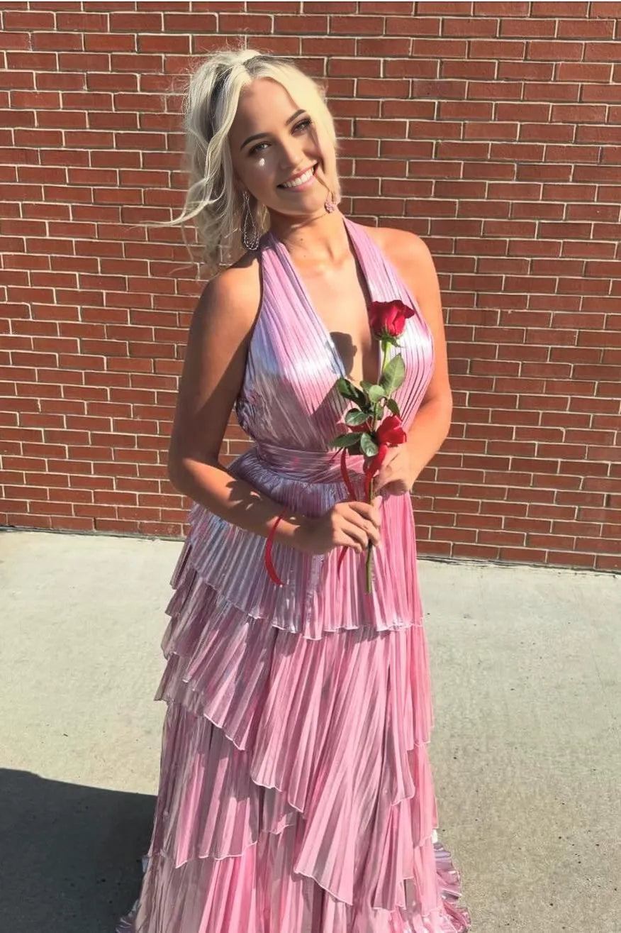 A-line prom dress in striking metallic purple blends modern glamour with playful elegance, crafted from a lustrous metallic fabric that catches light for a head-turning shine. It features a classic A-line silhouette that flows from the waist to a floor-length hem, paired with a sleek halter V-neck design frames the neckline and back beautifully while keeping the look sleek, and the sleeveless cut adds a fresh, airy touch for warm-weather events. The standout tiered skirt creates soft volume and movement, while a subtle slit on the side enhances mobility, making it easy to dance or walk without restriction.