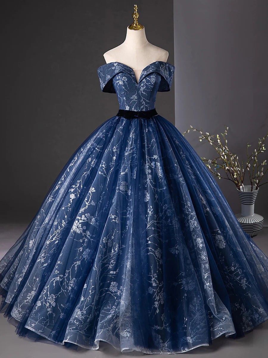 A-Line Navy Blue Glitter Printing Sweetheart Neck Off the Shoulder Prom Dress Evening Party Dress