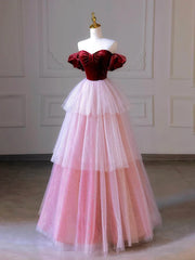 A-line prom dress in rich burgundy blends luxurious velvet and airy tulle for a romantic,features a flattering off-the-shoulder neckline that gracefully frames the collarbone and shoulders, paired with short sleeves to add soft coverage while highlighting feminine charm. The layered design creates a dreamy, cascading silhouette that flows beautifully, while the floor-length cut elevates the gown to red-carpet-worthy sophistication. The classic A-line shape flatters all body types, hugging gently at the waist before flaring softly, ensuring comfort without compromising style.
