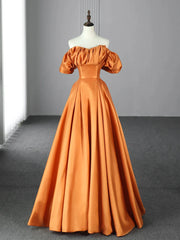 A-line prom dress in vibrant orange is crafted from smooth, lustrous satin, boasting a romantic off-the-shoulder neckline that gracefully frames the collarbone and shoulders. It pairs with practical short sleeves for subtle coverage and comfort, while delicate pleated details run through the gown, adding soft texture and gentle movement with every step. The classic A-line silhouette flatters all body types, hugging gently at the waist before flaring softly to the floor-length hem, ensuring both style and ease of movement.