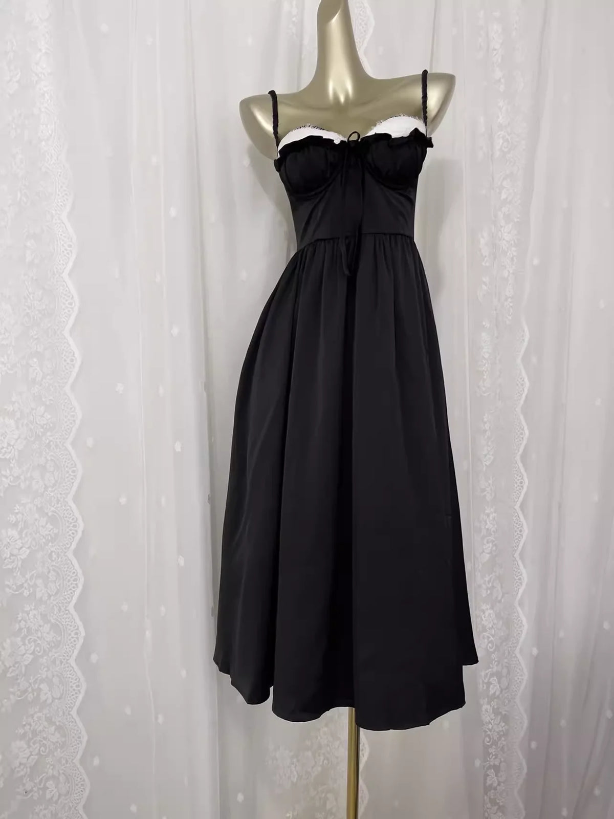 A line Spaghetti Straps Black Vacation Dress Satin Vintage Prom Dresses