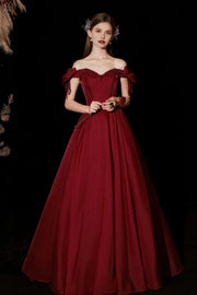 A-Line Sweetheart Off the Shoulder Beaded Satin Burgundy Long Prom Dresses