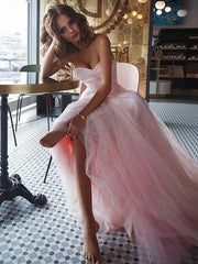 A-Line Sweetheart Sleeveless Sweep / Brush Train With Ruffles Tulle Pink Prom Dresses