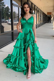 Stand out at your prom or formal event with this captivating A-Line Prom Dress. It boasts a V-neckline with ruffled detailing, a backless design with delicate spaghetti straps, and tiered ruffles cascading down the skirt, paired with a daring slit for a touch of allure. Crafted from glossy green fabric, the long silhouette ensures a graceful and confident stride.