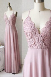 A-Line V Neck Spaghetti Strap Lace Chiffon Pink Long Prom Dresses