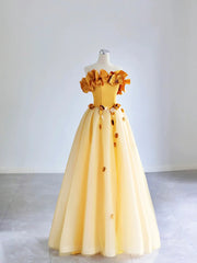 Bargain A-line prom dress in bright yellow blends affordable charm,crafted from soft, flowy tulle. It features an off-the-shoulder neckline that gracefully frames the collarbone, paired with a sleeveless design for a light, summery feel—while the showstopping backless detail adds a subtle, glamorous twist. Delicate applique accents adorn the tulle, adding texture and sophistication, and the classic A-line skirt flows gently from the waist to the floor-length hem, flattering all body types and ensuring easy movement for dancing.