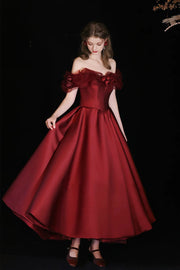 Beautiful Burgundy Satin Off Shoulder A-Line Tea Length Prom Dress Evening Party Dress