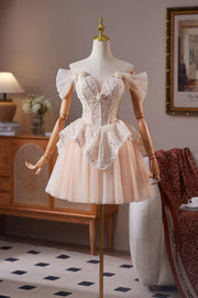 Beautiful Champagne Tulle Lace Off the Shoulder A-Line Short Prom Dress Party Dress