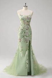 This elegant green mermaid prom dress features intricate appliqued sequins that catch the light beautifully. Designed with delicate spaghetti straps and a structured corset, it offers a flattering silhouette that enhances your figure. The floor-length skirt includes a tasteful slit, combining sophistication with a hint of allure, perfect for making a memorable entrance at any formal event.
