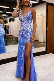 Stunning V-Neck Spaghetti Straps Appliques Mermaid Prom Dress with Slit