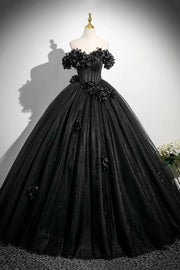 Black Tulle Flowers Off Shoulder A-Line Floor Length Prom Dress Party Dress with Corset