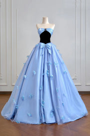 This elegant floor-length prom dress features a striking combination of black velvet and blue tulle, creating a sophisticated A-line silhouette. The strapless design offers a timeless look, while the flowing tulle skirt adds graceful movement, perfect for special occasions. Crafted for comfort and style, this dress is ideal for those seeking a refined yet eye-catching party outfit.