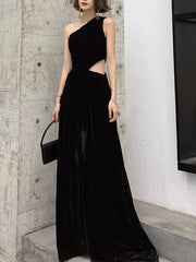 Black velvet long prom dress black velvet one-Shoulder evening dress