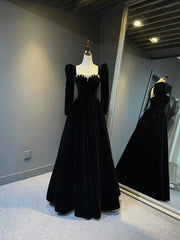 Elevate your formal occasions with this Black Velvet Sequins Prom Dress featuring a flattering sweetheart neckline and elegant long sleeves. The shimmering sequins add a sophisticated sparkle, while the A-line silhouette enhances your figure gracefully. Designed with a lace-up back, it ensures a perfect fit for comfortable wear throughout your evening. Ideal for prom, parties, or special events, this dress combines timeless velvet texture with modern details for a captivating look.