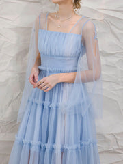 Blue tulle tea length prom dress, blue tulle formal evening dress