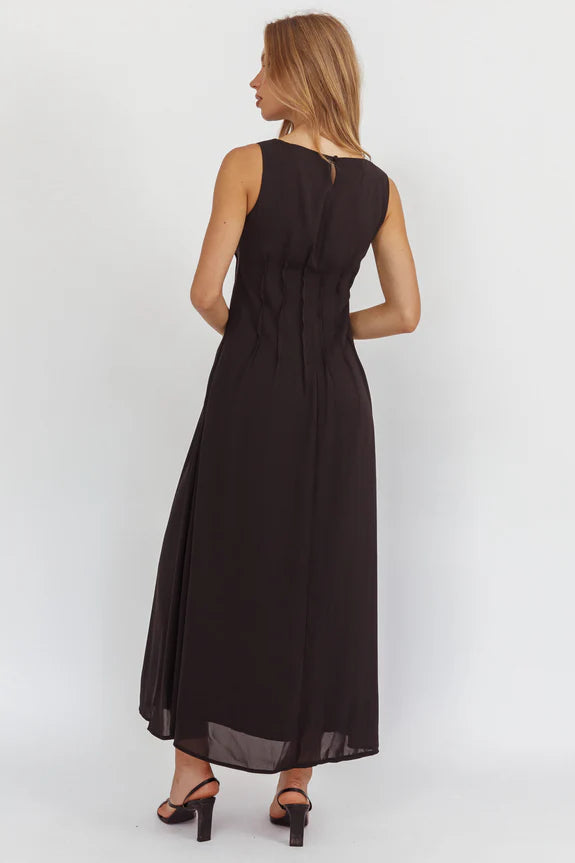 Casual Simple Jewel Neck Sleeveless Pintuck Pleat Black Maxi Homecoming Dress is a timeless and versatile piece. It features a classic jewel neckline that offers a refined and elegant look. The sleeveless design keeps you cool and allows for easy movement. Pintuck pleats on the bodice add subtle texture and visual interest, enhancing the dress's overall appeal.