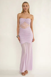 Casual Strapless Sheer Panel Ruched Lilac Maxi Homecoming Dress Prom Dress