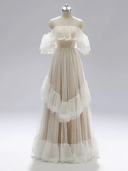 Champagne A line lace long prom dress, lace off shoulder bridesmaid dress