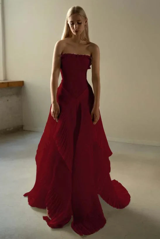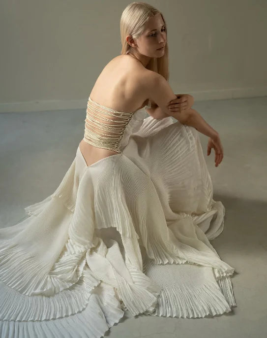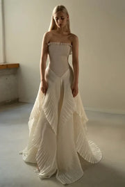 Elevate your formal wardrobe with this chic beige strapless prom dress, designed for a sophisticated silhouette. The sleeveless, pleated bodice enhances texture, while contrast color stitching adds refined detail. Its long length features an asymmetrical hem, combining elegance with contemporary flair. Perfect for making a memorable statement at any special event.