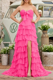 Chiffon Fuchsia Sweetheart Neck Tiered Ruffles A-Line Floor Length Prom Dress with Slit