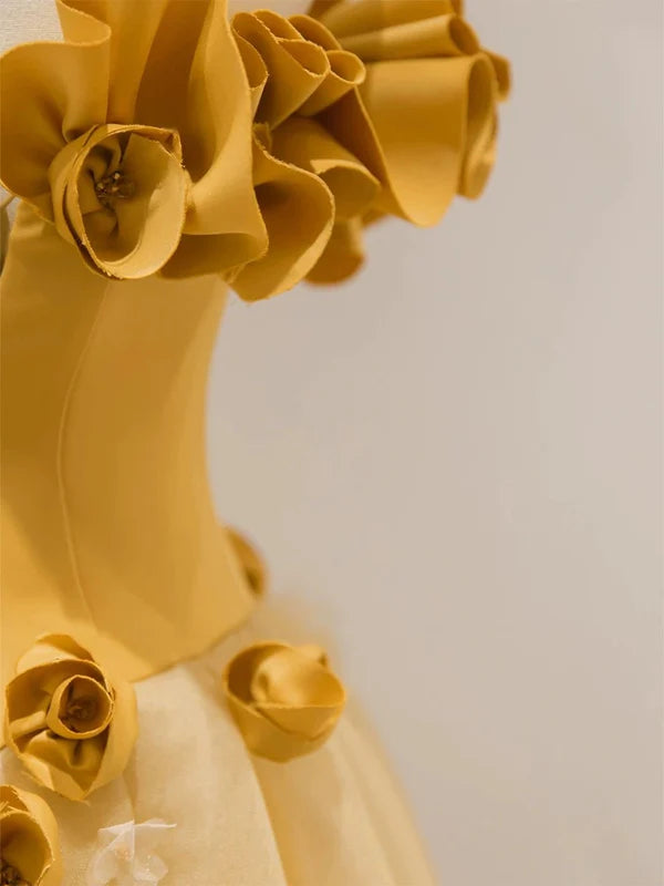 This elegant yellow ball gown features a strapless, sleeveless design crafted from delicate tulle. Adorned with intricate 3D floral accents, it combines classic sophistication with modern detail. The floor-length silhouette ensures a graceful presence at any prom or formal party, making it an exceptional choice for those seeking style and comfort in one stunning dress.