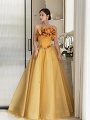 Classy Ball Gown Elegant Yellow Tulle Strapless Sleeveless 3D Flowers Long Prom Dresses Bargain Long Party Dresses