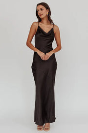 Cowl Neck Cutout Mesh Back Satin Black Maxi Homecoming Dress features a cowl neck that drapes elegantly, adding a touch of sophistication and allure. The cutout mesh back design brings a stylish and daring element, creating a perfect balance between elegance and sensuality while also allowing for breathability. Crafted from smooth satin fabric, the dress hugs your curves beautifully, ensuring both a flattering silhouette and comfort. The classic black hue is timeless and versatile, exuding a sense of understated glamour. The maxi length adds an air of grandeur, making it ideal for formal events.