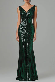Dark Green Mermaid V-Neck Sequins Pleated Unique design Formal Prom Dress