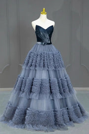 Elegant Blue Velvet Tulle Layered Strapless Ruffled A-Line Long Prom Dress Formal Dress
