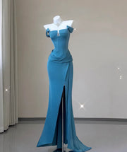 Elegant Mermaid Off-Shoulder Short Sleeves Pleated Slit Satin Blue Long Prom Dresses - US 2 / UK 6 / EU 32