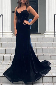 This elegant mermaid prom dress features a flattering bodycon silhouette crafted from rich velvet, designed to contour your figure beautifully. The deep V-neckline paired with delicate spaghetti straps adds a touch of sophistication, while the sweep train enhances its formal appeal. A stylish bow detail accentuates the waist, completing this refined look perfect for any special occasion.