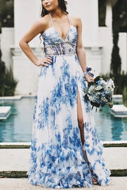 Elegant Ruffle Strap A-Line Printed V-Neck Pearl Slit Ball Gown