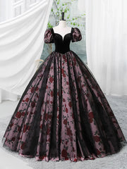 Elegant Velvet and Rose Print Short Sleeve A-Line Long Formal Dress Prom Party Dress