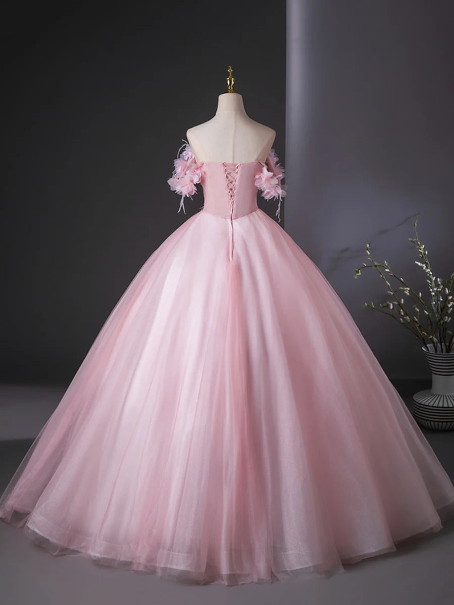Fairy Pink Tulle Flower Sweetheart Neck Off The Shoulder Floor Length Formal Dress Prom Dress