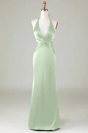 Full of charm Dusty Sage Satin Sheath Halter Long Bridesmaid Dress