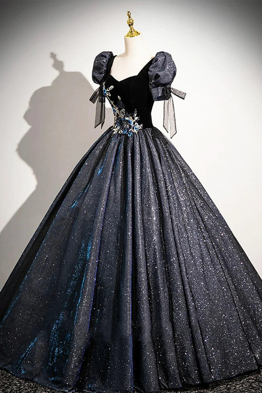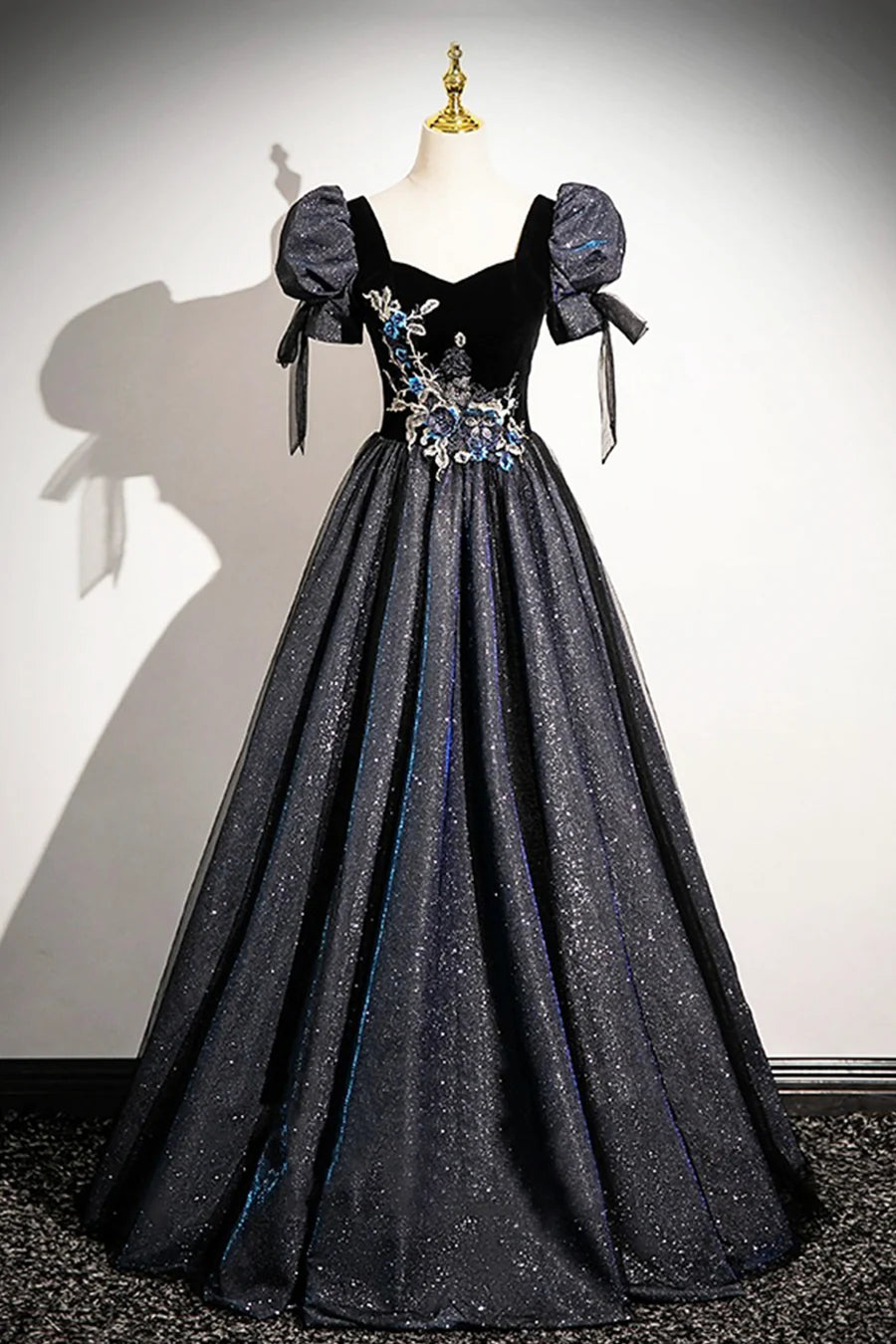 Glitter Black Velvet Short Sleeve A-Line Floor Length Prom Dress Evening Party Dress