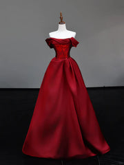 This exquisite burgundy satin ball gown combines timeless elegance with modern sophistication. Designed with an off-the-shoulder neckline and delicate beadwork, it offers a flattering fit and a luxurious finish. The floor-length silhouette enhances your presence at proms or graduations, making this dress a standout choice for memorable formal events.