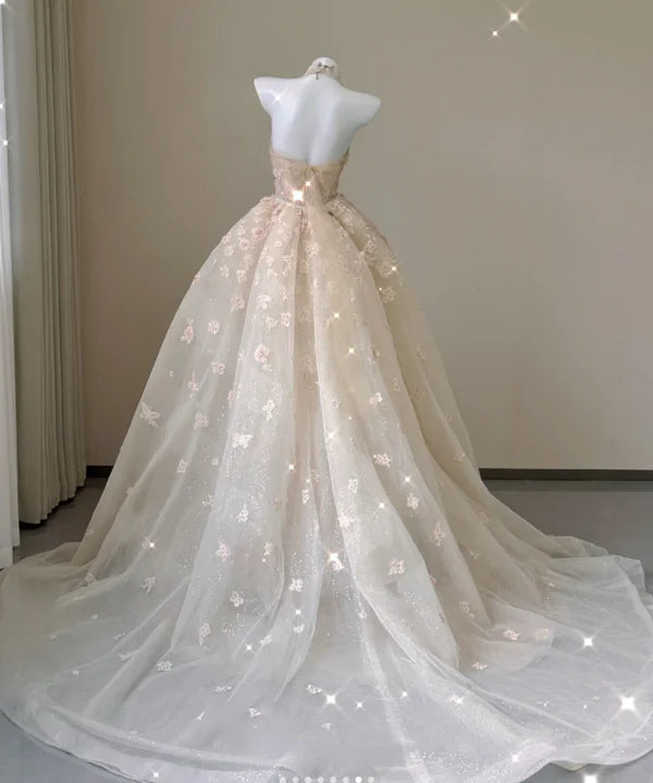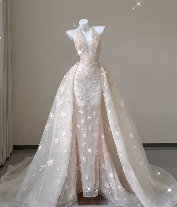 Gorgeous mermaid prom dress in soft pink crafted from luxurious embroidered lace, it features a sleek halter neckline that elegantly frames the neck and collarbone, paired with a sleeveless design to highlight smooth arm lines—striking the perfect balance between sophistication and allure. The intricate embroidered lace adds delicate texture and a sense of refinement, while the classic mermaid silhouette flatters beautifully.