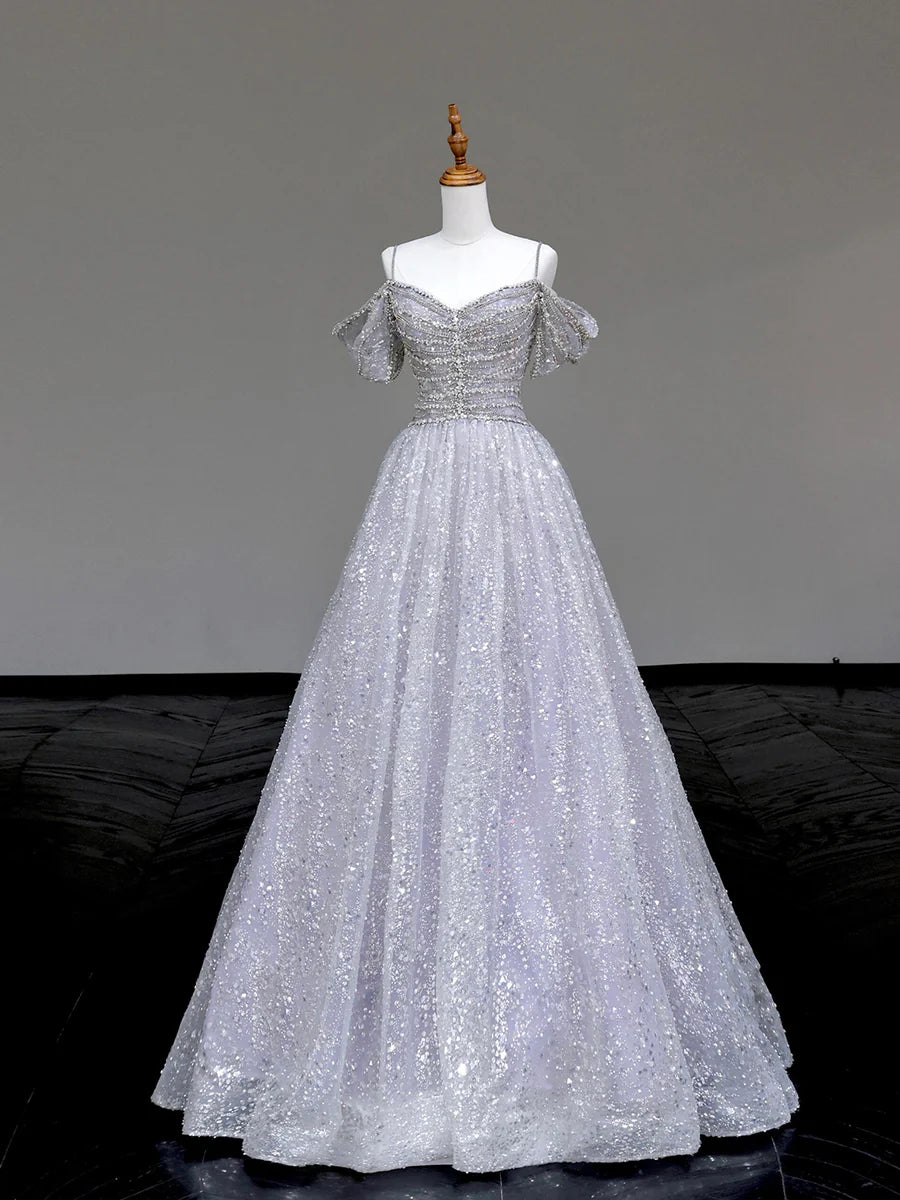 Gray Tulle Sequins Beaded Spaghetti Straps Floor Length Long Prom Dress Party Evening Dress