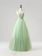 Green Tulle Pleated Spaghetti Strap A-Line Corset Long Prom Dress Evening Party Dress