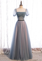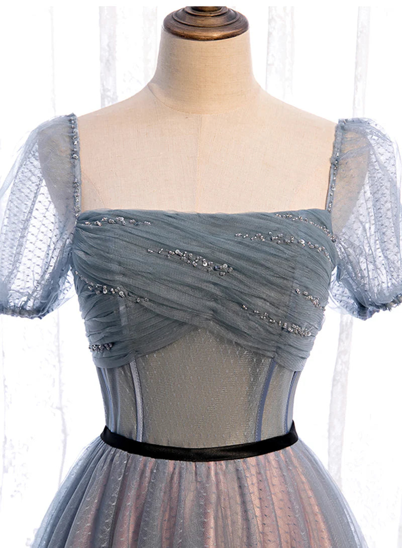 Grey Tulle Square Neck Short Sleeves Long Prom Dresses A-Line Evening Dresses With Beaded