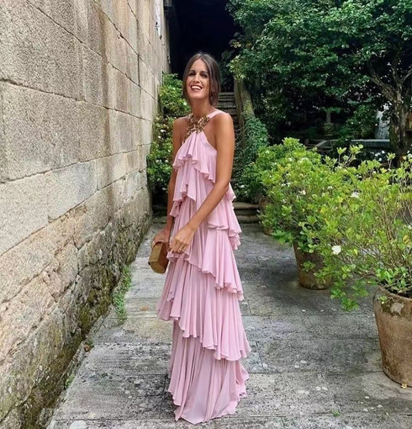 Halter Elastic Satin Floor Length Prom Dress With Layers Formal Gown