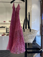 Hot Pink Floor Length Floral Beach Dress Women's Cute A line Straps Ruffled Prom Dresses