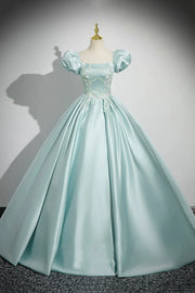 Ice Blue Satin Applique Square Neck Short Sleeve A-Line Long Prom Dress Evening Party Dress