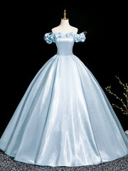 Light Blue Satin With Applique Off the Shoulder A-Line Floor Length Prom Dress Party Dress