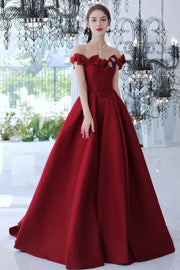 Make a memorable entrance in our Lovely A-Line 3D Flowers Bow Satin Burgundy Long Prom Dresses With Short Train. It showcases an alluring off-the-shoulder neckline, adorned with charming 3D flower bow details that add a touch of romance and uniqueness.Crafted from smooth satin in a rich burgundy hue, the A-line silhouette flows gracefully to the floor, with a short train for an elegant finish.